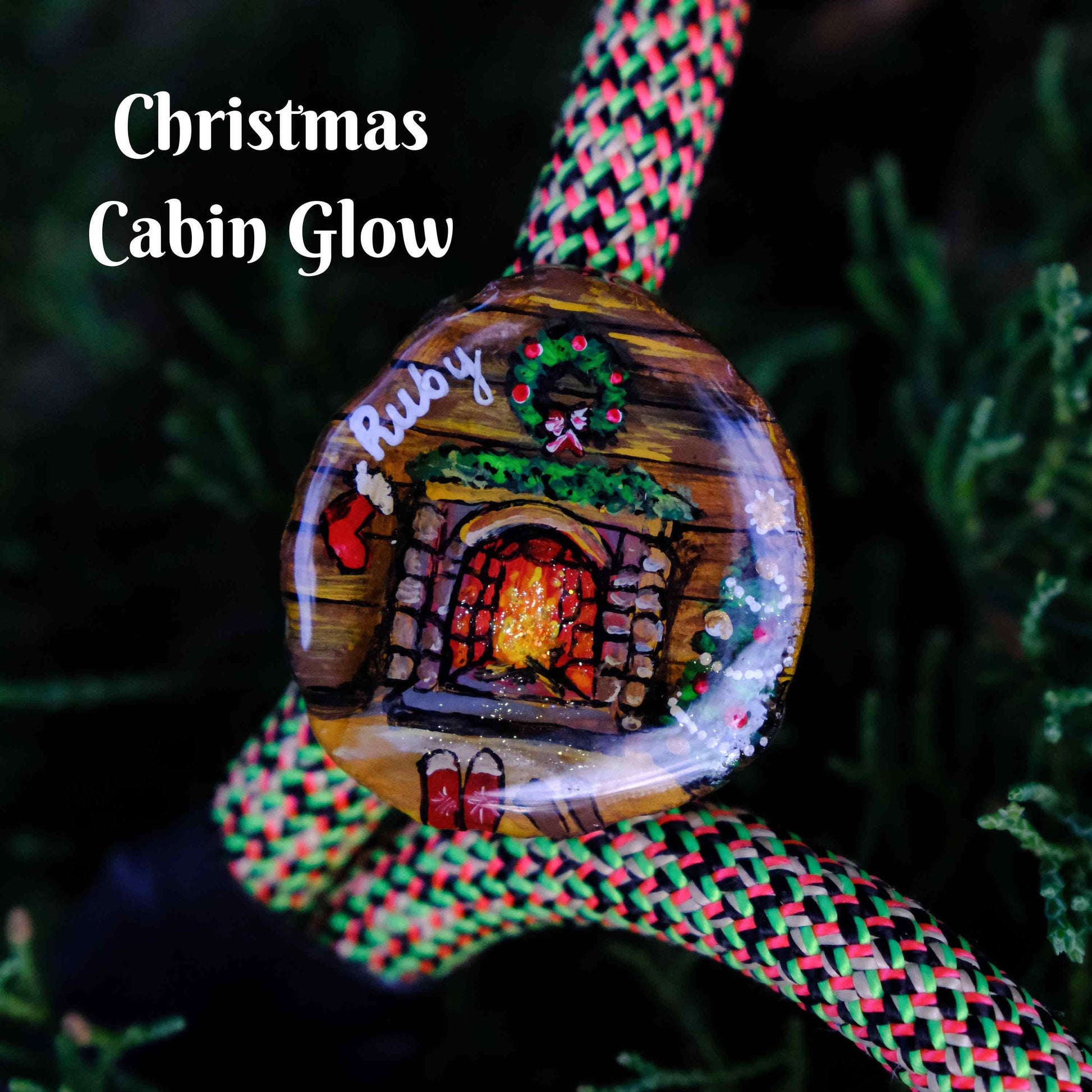 • Hand painted deer antler tag (Your choice of Christmas Cabin Glow or Aurora Cabin Solstice) or Reversible bandana in Cozy Fireside Plaid